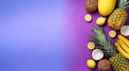 Exotic pineapples, coconuts, banana, melon, lemon, tropical palm and green monstera leaves on purple, violet background with copyspace. Creative layout. Monochrome summer concept. Flat lay, top view