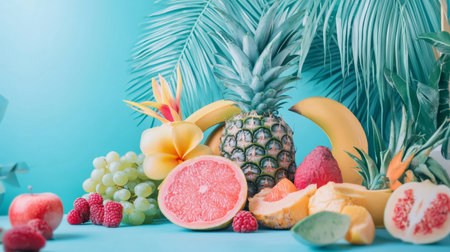 A vibrant arrangement of tropical fruits including pineapple, grapefruit, bananas, and more, displayed against a blue background with palm leaves. The image is fresh, colorful, and evokes a sense of tropical paradise.