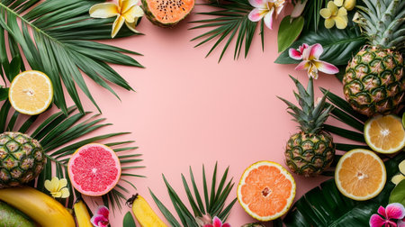 A tropical-themed layout featuring pineapples, grapefruits, bananas, and palm leaves framing a pastel pink background, creating a vibrant, summer-inspired design.