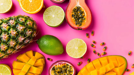 exotic summer fruits: papaya, pineapple, lime, yellow mango and passion fruit on pink background.