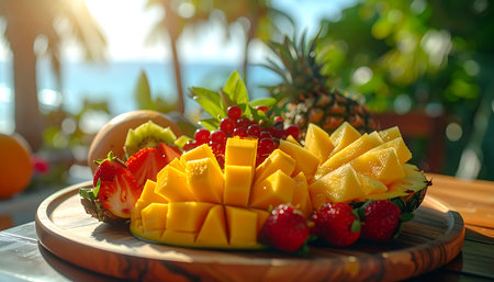 Mango fruit on a wooden plate with fresh fruits on the beach