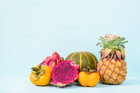 Tropical fruit (persimmon, dragon fruit, pineapple and melon) on pastel background