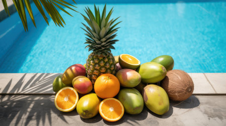Tropical Fruit Assortment by a Sparkling Blue Swimming Pool
