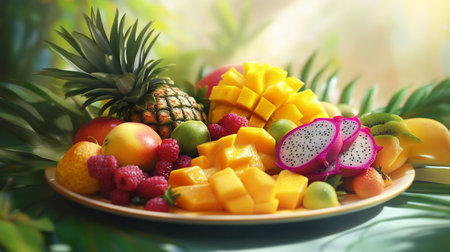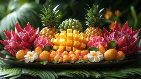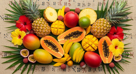 A vibrant arrangement of fresh tropical fruits including pineapple, papaya, mango, passion fruit, and lychee, interspersed with lush green monstera...