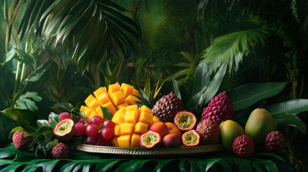 A tropical fruit platter with Thai mango, passion fruit, and lychee, set against a lush jungle backdrop.