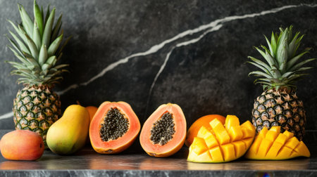 A vibrant display of tropical fruits featuring pineapples, papayas, and mangoes on a dark stone background, perfect for promoting a healthy lifestyle and culinary inspirations.