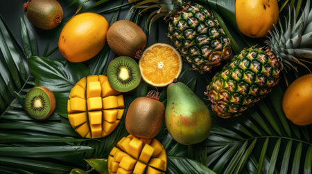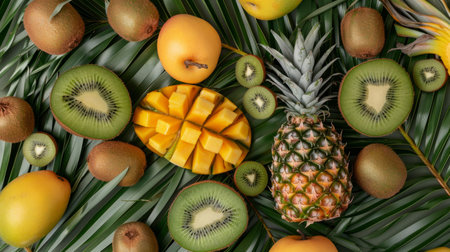 A composition of tropical fruits (kiwis, pineapples, mangoes) on a palm leaf background generative ai