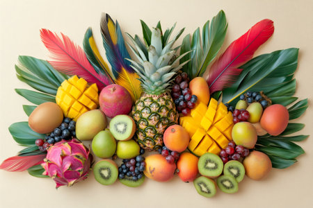 Pineapple, mango, kiwi, grapes, and dragon fruit arranged with colorful feathers and tropical leaves on a beige background