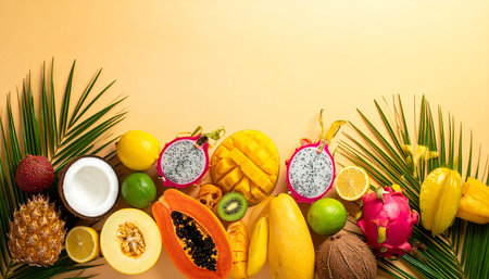 A vibrant flatlay featuring exotic fruits like dragon fruit, mango, pineapple, and passion fruit, arranged on a geometric background.