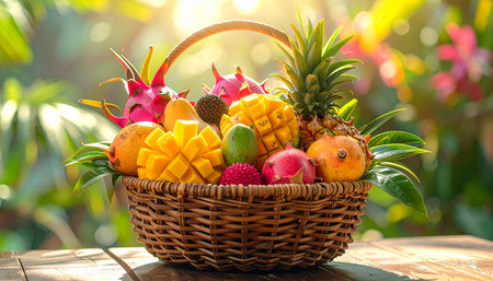 A vibrant basket filled with an assortment of exotic tropical fruits, including pineapple, papaya, mango, dragon fruit, and lychee. The colorful display sits on a wooden table, representing freshness and healthy eating.