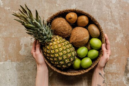 cropped view of woman holding ripe exotic fruits in wicker basket on weathered surface
