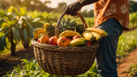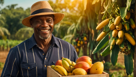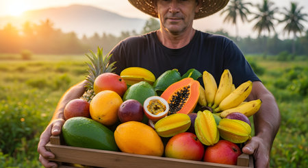 A smiling farmer wearing a hat holds a wooden crate filled with fresh tropical fruits like mango papaya and bananas. The background shows a sunny plantation with palm trees highlighting a bountiful harvest.