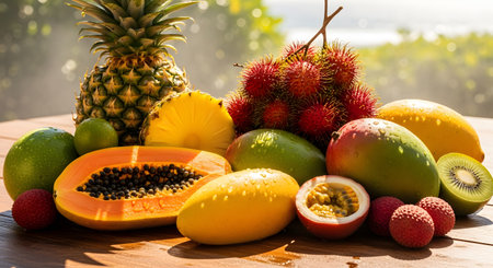 A vibrant collection of fresh tropical fruits, including pineapple, rambutan, mango, and papaya, is displayed on a wooden table. The sunlit background highlights the juicy textures and rich colors of the harvest.