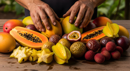 A pair of hands sorts through a vibrant pile of tropical fruits, including papaya, starfruit, and lychees, on a wooden table. The scene highlights the abundance and freshness of an exotic fruit harvest ready for consumption.