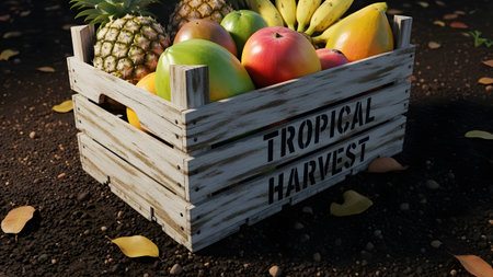 A rustic wooden crate stenciled with 'TROPICAL HARVEST' is filled with fresh pineapples, mangoes, and papayas. The crate sits on dark soil, emphasizing the farm-to-table concept of agricultural produce.