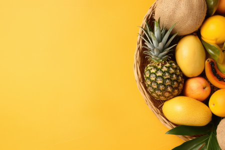 A photo of tropical fruits arranged in a straw bag on a yellow background, seen from above. There is