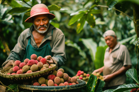 Farmers harvesting lychees in a plantation, putting them in wicker baskets, exotic fruits, agriculture
