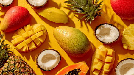 A variety of tropical fruits, including pineapple, mango, and coconut, arranged in a colorful display.
