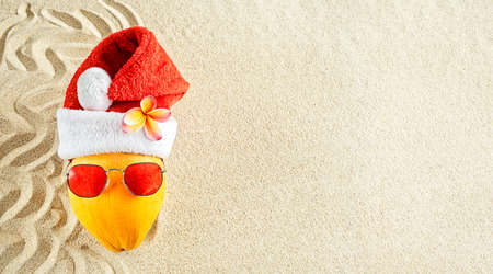Fresh yellow coconut in a red Santa Christmas hat with red sunglasses in sand, top view. Holiday tropical summer concept.