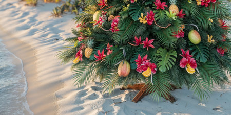 Christmas tree decorated with exotic fruits and flowers stands on a beach at sunset, blending holiday spirit with tropical vibes