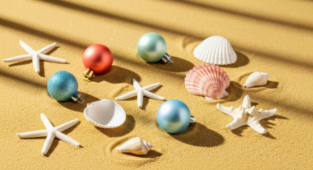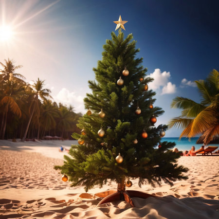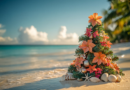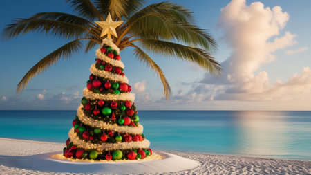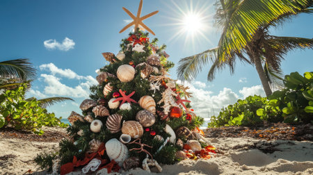 A tropical Christmas tree on a sunlit Caribbean beach, decorated with seashells, starfish, and holiday ornaments