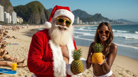 Christmas - Santa Claus Having a Drink at Copacabana Beach with Girls