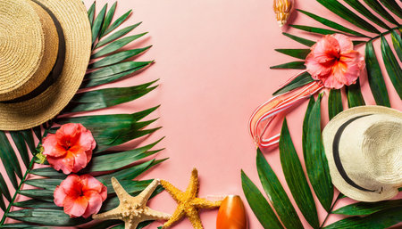 straw hat and sunglasses on a background of palm leaves. Creative tropical summer travel top view layout. Flat lay. Vacation concept