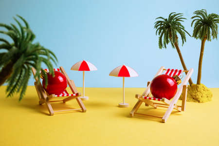 Creative New Year photo Christmas balls resting on the beach