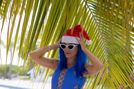 Woman with blue hair and sunglasses wearing swimsuit putting on Christmas hat.