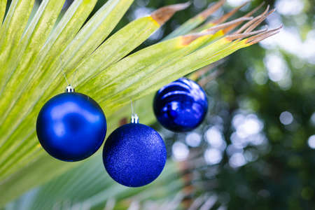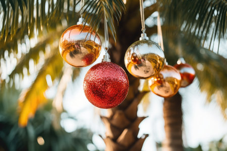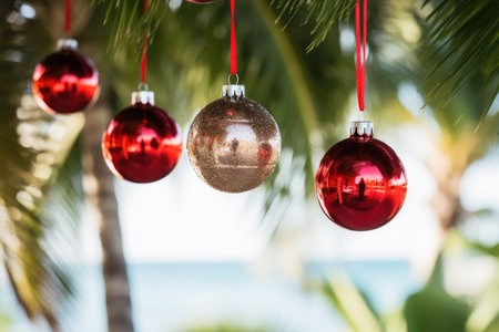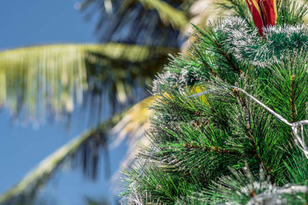Red christmas baubles hanging on a decorated pine tree with blurred palm trees and blue sky in the background, celebrating christmas in a tropical destination