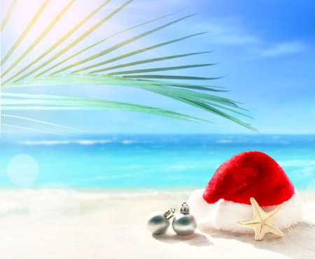 Christmas background with red Santa Hat on caribbean beach.