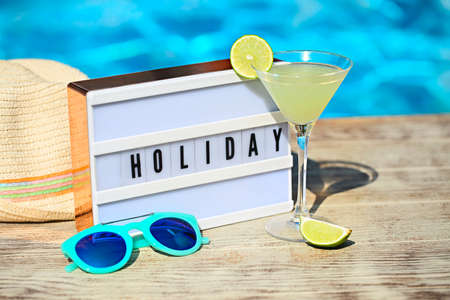 Light letterbox, hat, sunglasses and Daiquiri cocktail with lime on the pool background