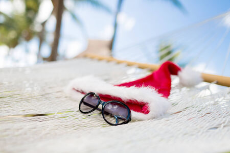 vacation, christmas and holiday concept - picture of hammock with santa helper hat and sunglasses