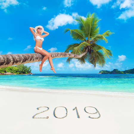 Happy New Year 2020 is coming concept sandy tropical ocean beach lettering nature background