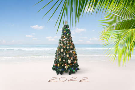 Christmas in the tropics. Christmas tree decorated with balls and garlands on a tropical beach near the ocean. Copy space