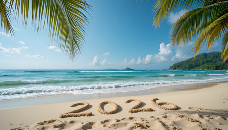 Happy new year beach concept, 2026 written on the sand. Summer holiday on tropical island. Palm trees and sea waves.