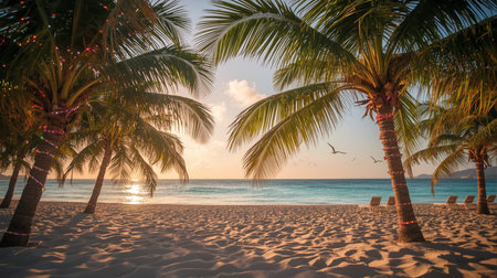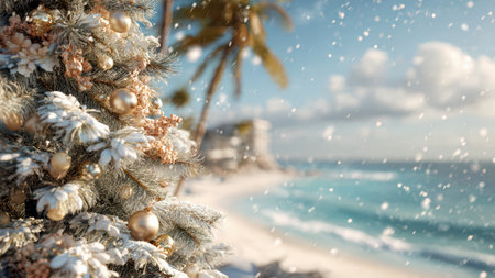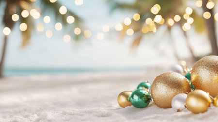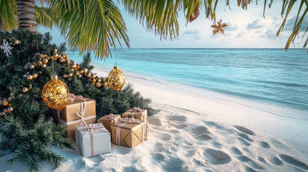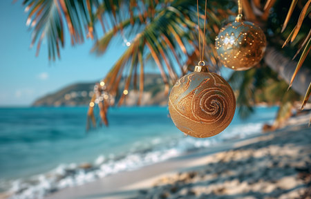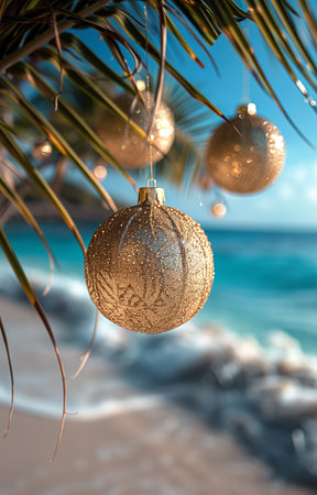 Golden Christmas ornaments adorn palm branches, casting festive glimmers against the serene azure sea