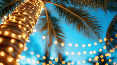 Warm string lights illuminate a tropical palm tree, creating a festive atmosphere at dusk
