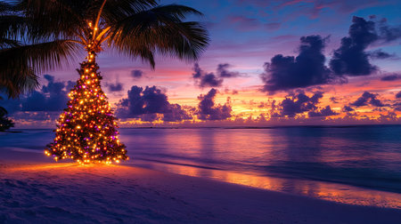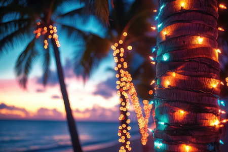 Christmas lights wrapped around a palm tree trunk on a tropical beach at sunset creating a magical holiday atmosphere