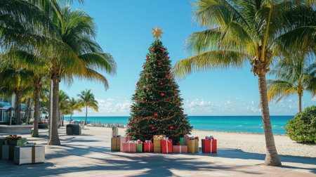 A decorated Christmas tree on a sunny Miami beach, surrounded by tropical palm trees and gift boxes, with the sparkling blue ocean in the background.