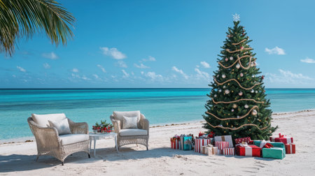 A festive Miami Christmas setup with a decorated fir tree on the sand, presents scattered below, and the vibrant blue sea glistening in the background.