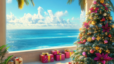 A Miami-inspired holiday scene featuring a Christmas tree decorated with tropical ornaments, gift boxes below, and the blue ocean stretching beyond.