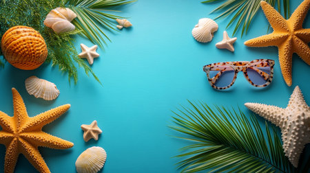 Beach accessories with shells and sea stars on a colored background