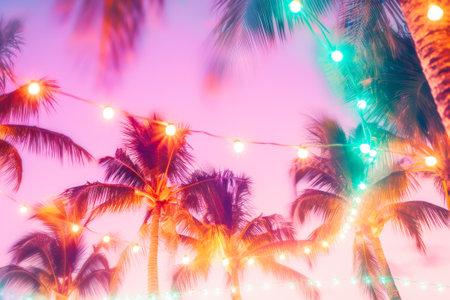 Holiday background of tropical palm trees illuminated by vibrant string lights against sunset pink sky, evoking warm, festive and magical atmosphere of serene evening. Concept of resort and vacation
