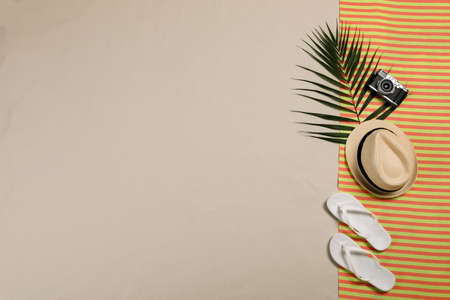 Striped beach towel, hat, camera, tropical leaf and flip flops on sand, top view. Space for text