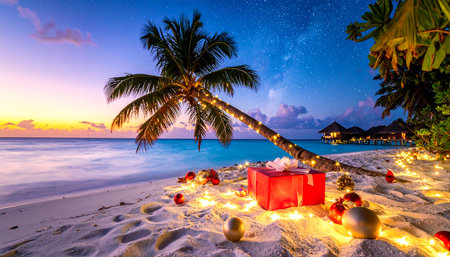 A beachside Christmas celebration in the Maldives, with gift boxes, fairy lights, and a small decorated pine tree against a turquoise lagoon.