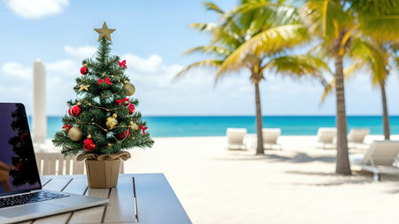 Laptop on wooden table with Christmas tree on tropical beach.