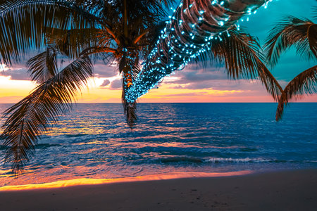 Stunning sunset over a tropical beach with palm trees adorned with string lights. Serenity and relaxation.
