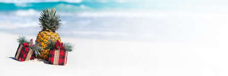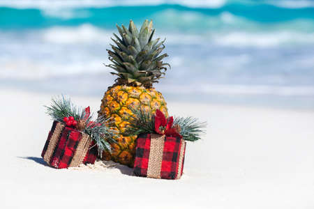 Tropical celebration on beach, present boxes and fresh pineapple