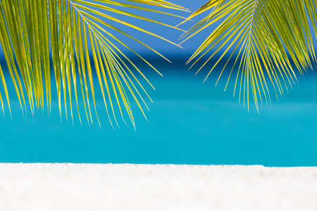 Tropical sandy beach with white sand, turquoise caribbean sea and coconut palm tree leaves